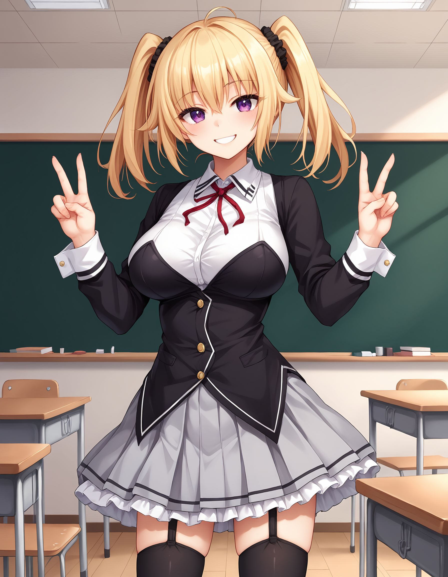 服装01,黑色短外套,黑色长袖,白色袖口,黑色胸衣,白色镶边胸衣,4颗纽扣,白色领衬衫,环形领结,红色环形领结,灰色裙子,百褶裙,荷叶边镶边裙子,黑色过膝袜,吊袜带,绝对领域,