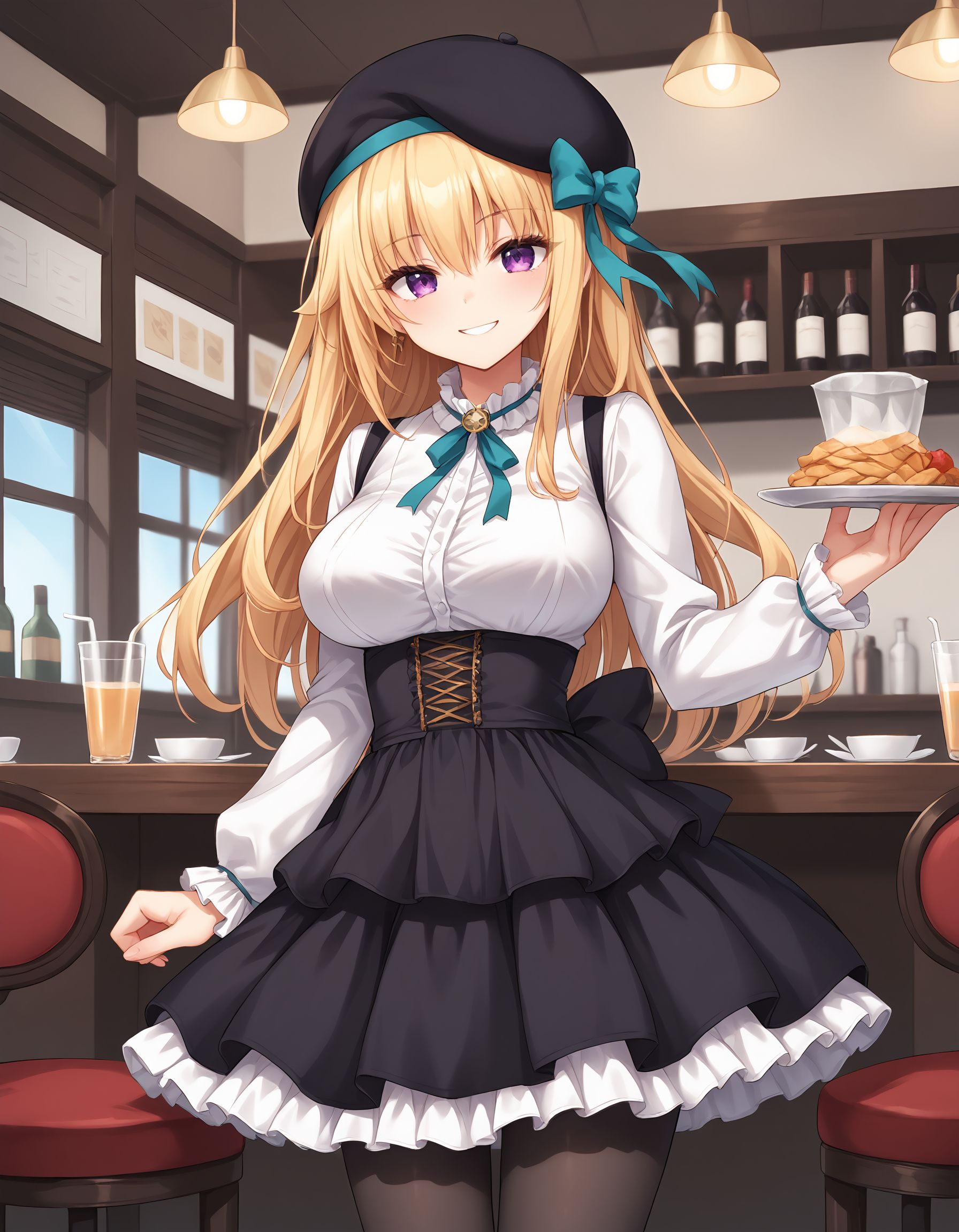 服装02,衬衫,白色衬衫,带荷叶边领子的衬衫,长袖,荷叶边袖口,黑色裙子,高腰背带裙,层叠裙子,荷叶边镶边裙子,连裤袜,黑色连裤袜,颈带,绿松石色颈带,颈带配饰,金色配饰,猫形配饰,黑色贝雷帽,贝雷帽上绿松石色颈带,