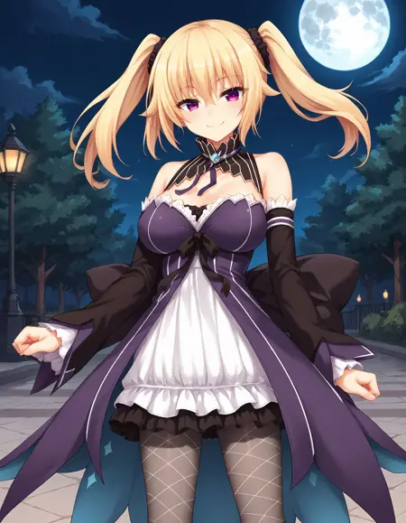 outfit05, 투닉 코트, 보라색 투닉 코트, 투닉 코트 뒤 큰 검은 리본, 흰색 다이아몬드 무늬, 청록색 선으로 장식된 투닉 코트, 투닉 코트 꼬리, 가슴 아래 둘러진 검은 리본, 드레스, 흰색 드레스, 프릴 장식 드레스, 어깨 노출, 분리형 소매, 프릴 장식 소매, 소매단, 분리형 소매단, 회색 팬티스타킹, 피쉬넷 팬티스타킹, 목 리본, 보라색 목 리본, 리본 장식, 은색 장식, 고양이 장식,