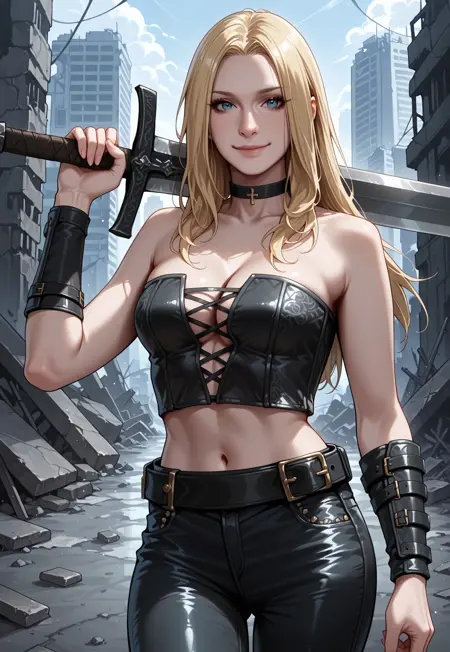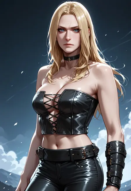 버스티어, 가슴 노출, 허리 노출, 가죽 팬츠, 한쪽 팔 보호대, 목걸이, 벨트,