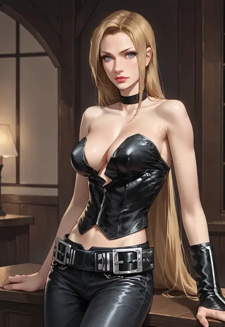 버스티어, 가슴 노출, 허리 노출, 가죽 팬츠, 한쪽 팔 보호대, 목걸이, 벨트,