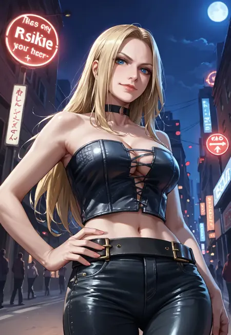 bustier, cleavage, midriff, leather pants, single arm guard, choker, belt,