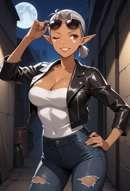 Custom outfit: 1mpa, short hair, short ponytail, grey hair, red eyes, facial mark, pointy ears, red lips, dark-skinned female
