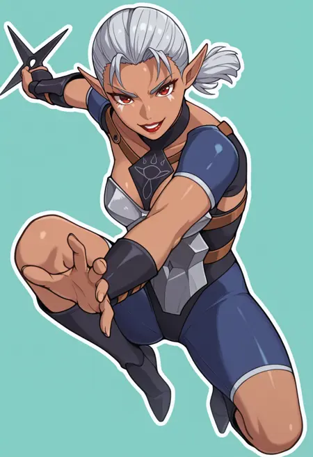 Default appearance: 1mpa, short hair, short ponytail, grey hair, red eyes, facial mark, pointy ears, red lips, dark-skinned female, breastplate, blue bodysuit, collared leotard, shoulder armor, vambraces, bike shorts, blue shorts, knee boots, blue footwear