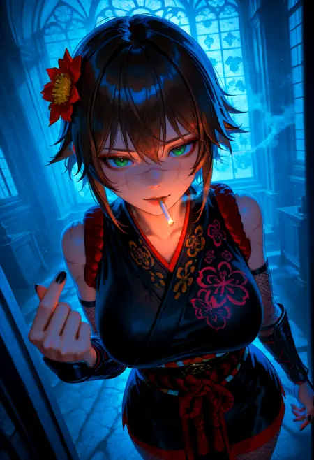 1소녀, 얼굴에 흉터, 녹색 눈, 짧은 머리, 갈색 머리, 큰 가슴, 넓은 엉덩이,