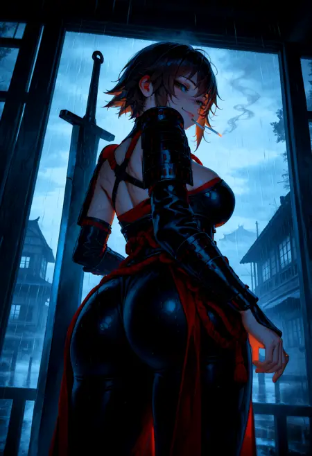 일본 갑옷, 가슴 노출, 분리된 소매, 장갑, 어깨 보호대, 등에 착용한 칼,