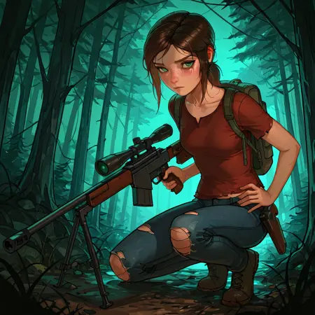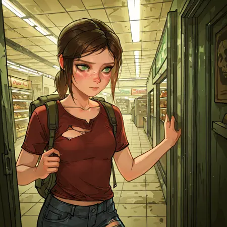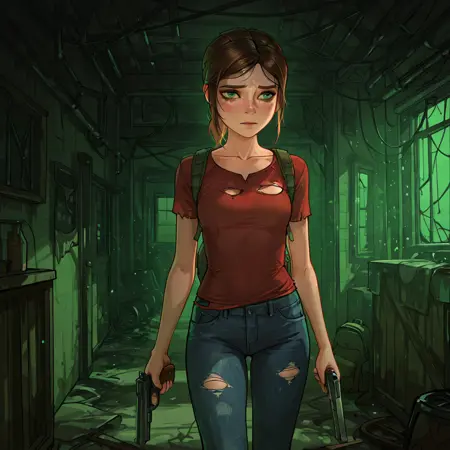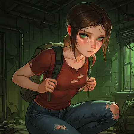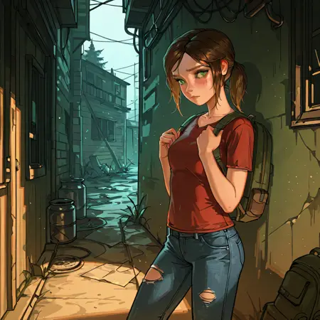 사용할 수 있는 태그: ellie williams, the last of us, freckles, pale green eyes, torn red t-shirt, jeans, backpack, torn clothes