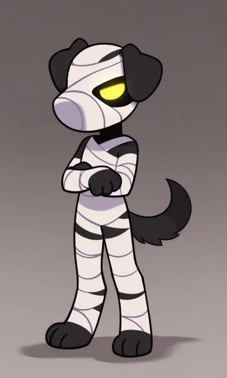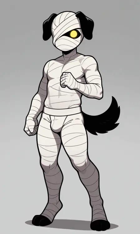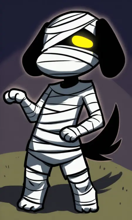 触发词:Lucky-AC,拟人化,男性,狗,木乃伊,发光黄眼,无瞳孔,黑色皮毛,黑色皮肤,黑色尾巴,绷带,两只黑色狗耳,充满绷带的身体,一只眼睛可见,全身,单人