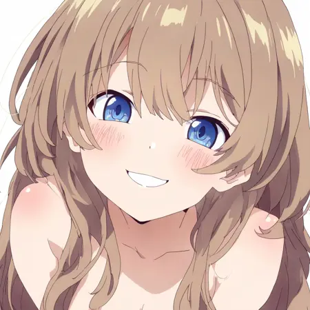 anime screenshot,solo,1girl,looking at viewer,smile,long hair, blush,,simple background,white background,upper body,