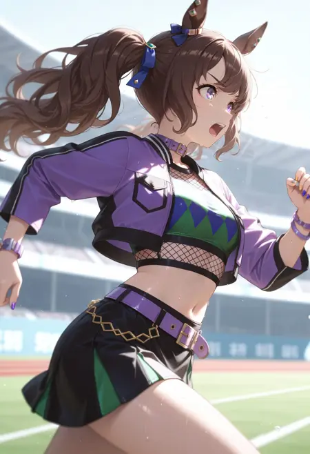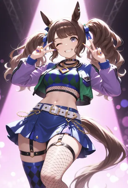 Oufit : T0sen, 1girl, animal ears, twintails, brown hair, long hair, grey eyes, horse girl, multicolored nails, nail polish, cropped jacket, midriff,navel, purple belt jewelry, collar, crop top, fishnet top, open clothes, open jacket,shirt, fishnets, black skirt, long sleeves, bracelet,