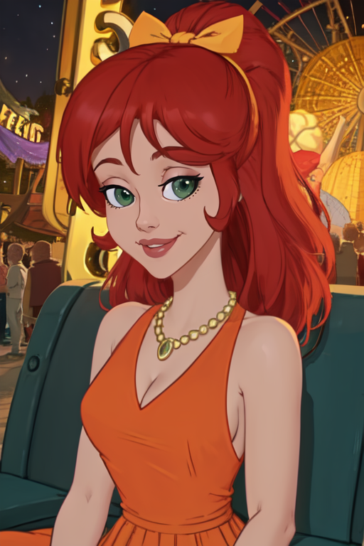 orange dress, gold necklace, hair bow, orange heels, was trained to some degree
