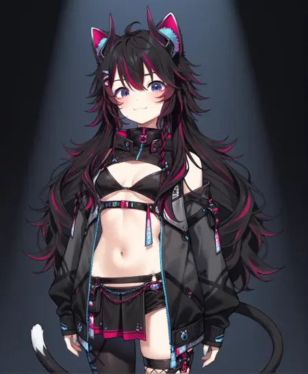 PROMPTS : aiko, 猫耳, 染发, 猫尾, 长发, 小胸, 露脐, 短裙, 角, 不对称裤装, 蓝色眼影, 蓝眼, 夹克