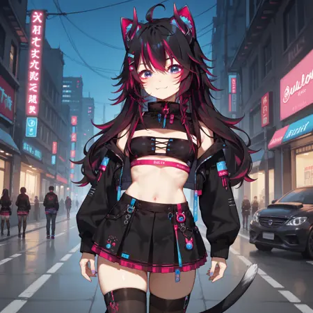 PROMPTS : aiko, cat ears, streaked hair, cat tail, long hair, small breast, midriff, short skirt, horns, asymetrical legwear, blue eyeshadow, blue eyes, jacket