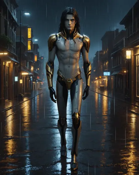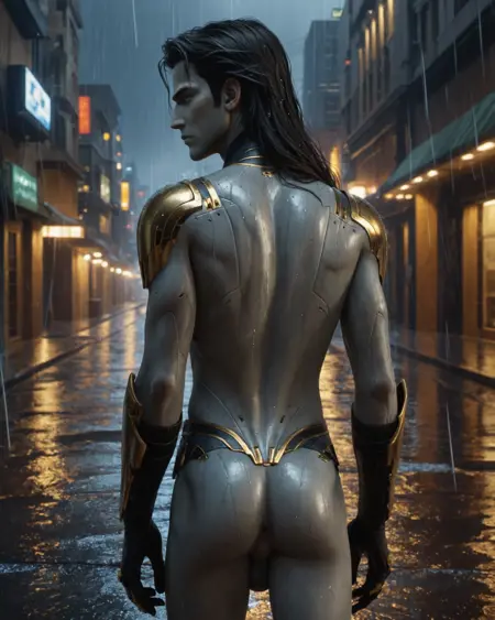Main Keywords: arch0n, blue eyes, black hair, long hair, colored skin, grey skin, grey face:2, grey nose:2, grey cheeks:2, grey forehead, bare chest, gold pauldrons, black neck, mechanical shoulders, mechanical neck