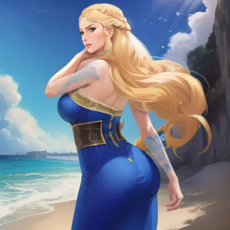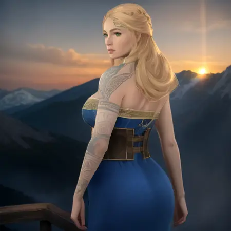 - アクティベーションタグは設定されていないが、適切なプロンプトでアクティベート可能。この場合は:長い髪、編み髪、タトゥー、肩のタトゥー、青いドレス、ストラップレス、金髪、裸の肩、緑の目