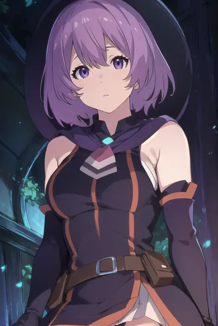 裙子,过膝袜,手套,帽子,裸露肩膀,紫色头发,分离袖子,女巫帽,