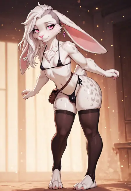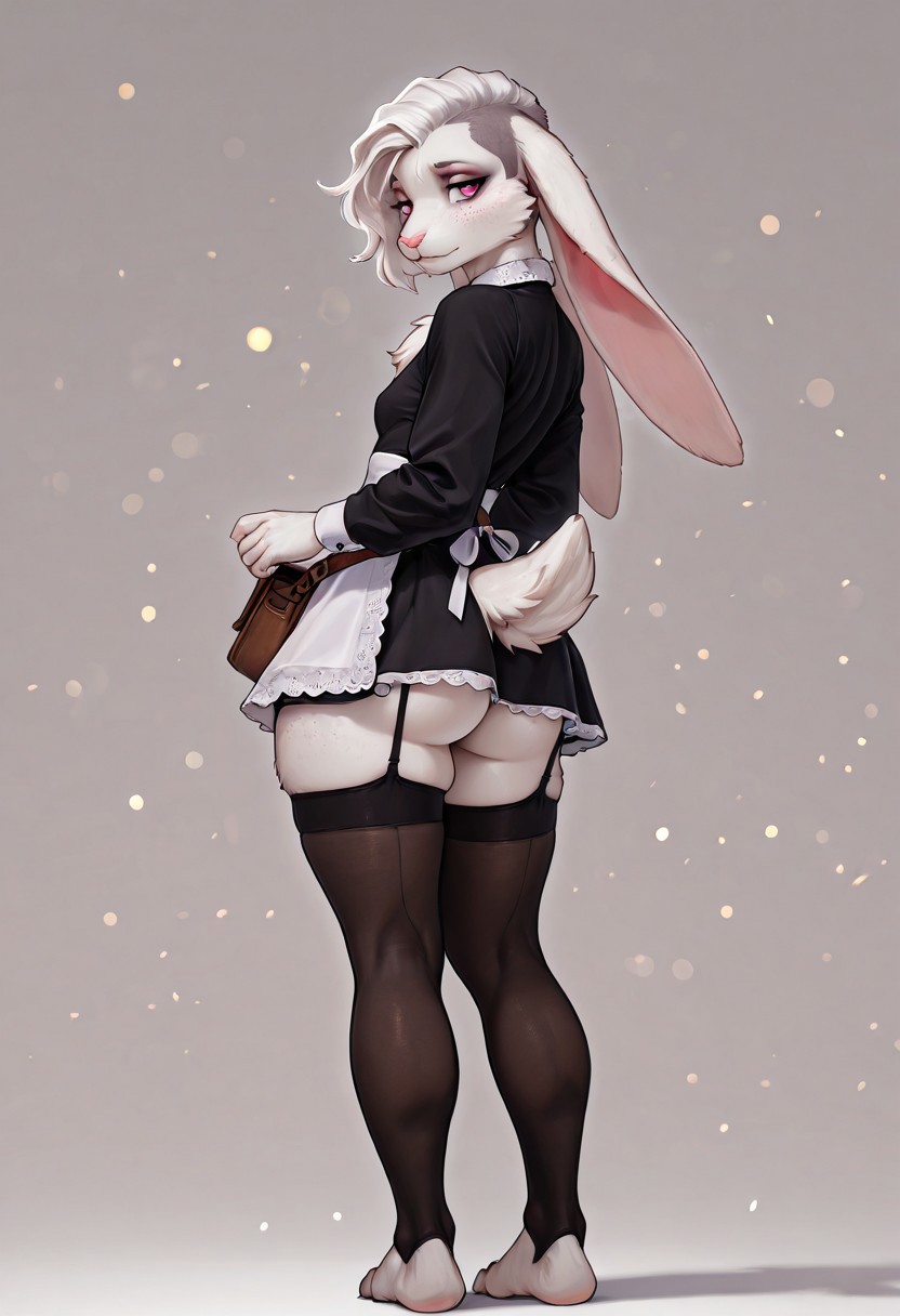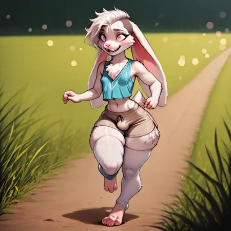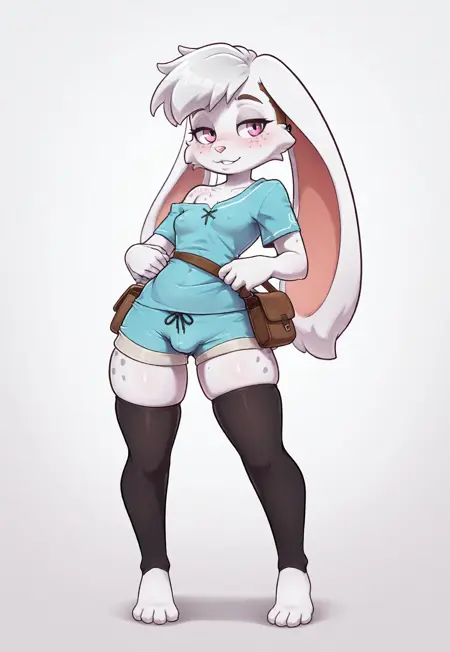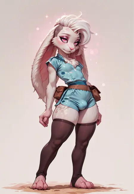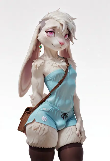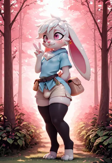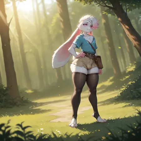 The first LoRA for OC Lacy Thistlepuff, a rabbitfolk hunter and tracker who was unfortunately glamoured by fey to have eternal beauty. To his chagrin, it made him into a permanent femboy, his fey glamour attracting all sorts of suitors and beasts to desire him.