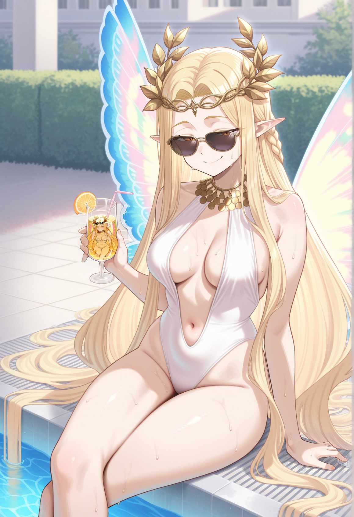 주요 태그: 성인 여성, 매우 긴 머리카락, 금발, 주황색 눈, 뾰족한 귀, 월계관, 보석, 목걸이, 긴 드레스, 프릴, 가슴 노출, 스톨, 다채로운 날개, 곤충 날개, 땋은 머리
