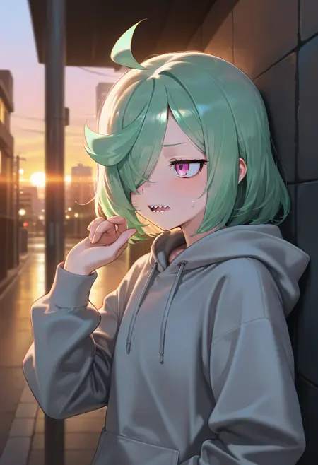 她的外貌标签: 1girl, solo, 短发, 紫色眼睛, 中等胸部, 绿发, 头发遮住一只眼睛, 水色头发, 尖牙,