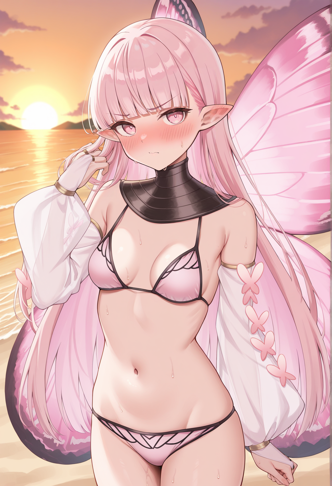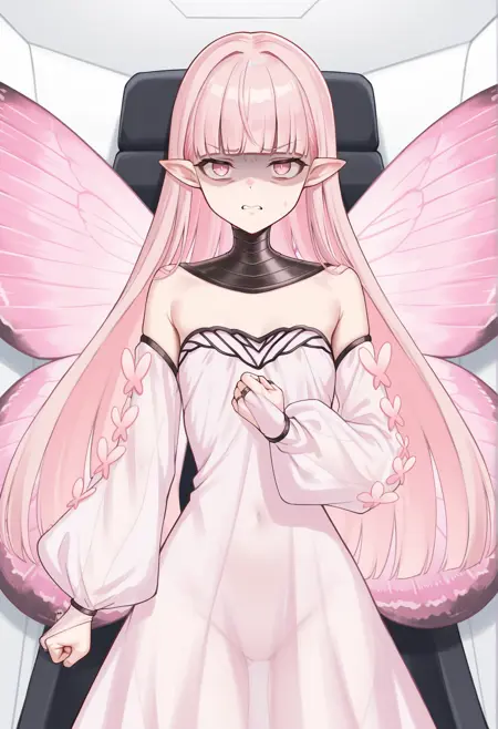 long hair, pink hair, pink eyes, pointy ears, blunt bangs, butterfly wings, detached collar, pink dress, detached sleeves, bridal gauntlet