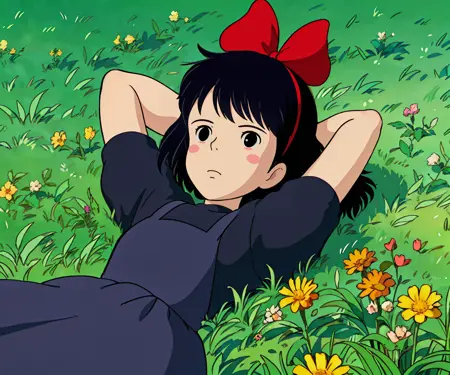 Prompt: 1girl, solo, blush, smile, short hair, brown hair, dress, bow, hair bow, hairband, outdoors, bag, black eyes, red bow, tree, blush stickers, railing, kiki \(majo no takkyuubin\), lora:ghibli\_anime\_v1:0.6