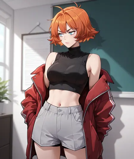 Casual Outfit : black tank top, off shoulder, red jacket, grey shorts, midriff, ahoge, bare shoulders,