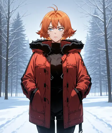 Winter Coat : winter coat, black clothing, wearing black in winter coat, ahoge, fur trim, fur trimmed hood,