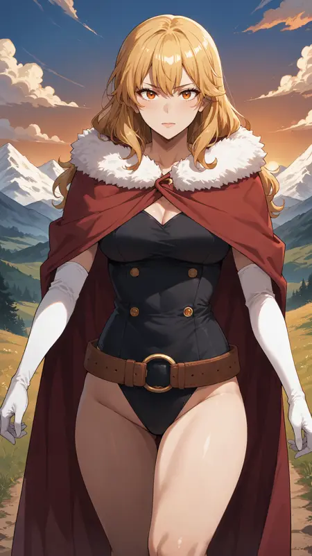 gina_sl, long hair, blonde hair, orange eyes, bangs, red cape, fur trimmed cape, black leotard, white gloves, elbow gloves, brown belt, o-ring belt,