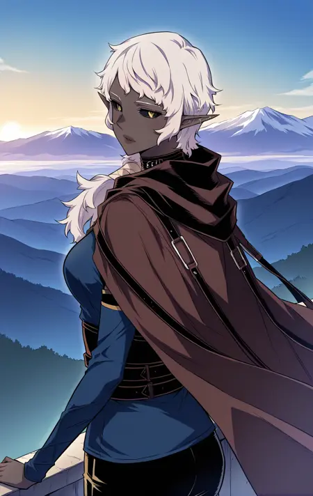Camil, 1 girl, solo, yellow eyes, black sclera, dark skin, pointed ears, dark elf, white hair, short hair, messy hair, uneven bangs, messy bangs, side ponytail, white hair ribbon,