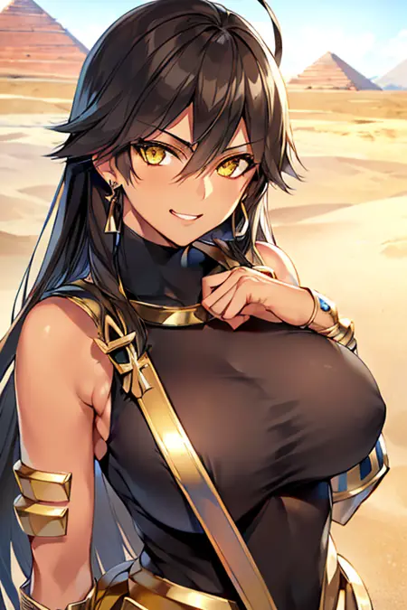 ozymandias - first ascen (fate), dark-skinned male, brown hair, short hair, yellow eyes, hair between eyes, ahoge, abs, black bodysuit, sleeveless, golden gauntlets, waist fauld, arm guards, egyptian clothes, earrings, jewelry