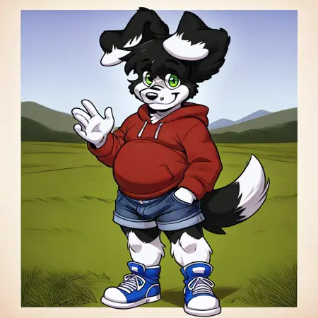 anthro, male furry, dog boy, border collie, black and white fur, green eyes, dog ears, fluffy tail, chubby, shortstack,