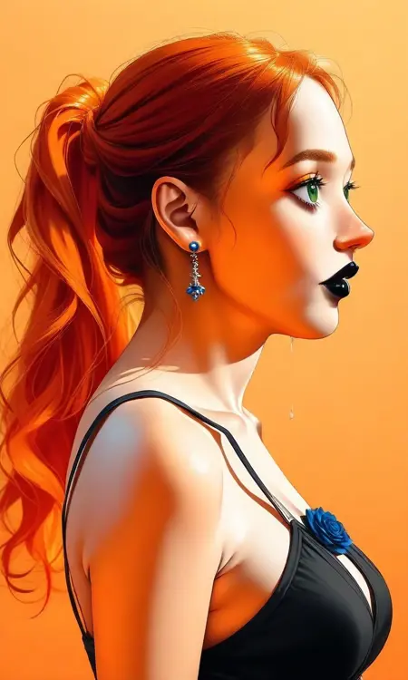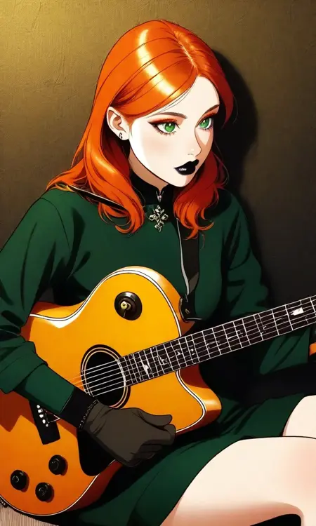 1girl,medium hair,orange hair,green eyes,goth,black lips,black choker,spiked choker,spiked bracelets,short sleeves,black dress,belt