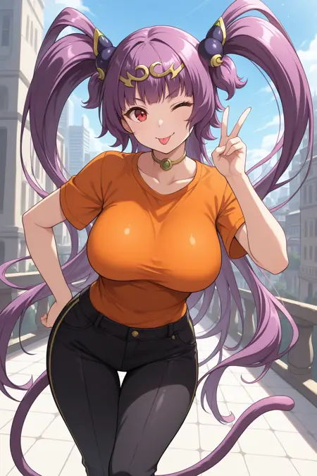 触发词为“qbstn”,且必须包含“紫色头发、红色眼睛、双马尾、极长发、阴部纹身、尾巴”。