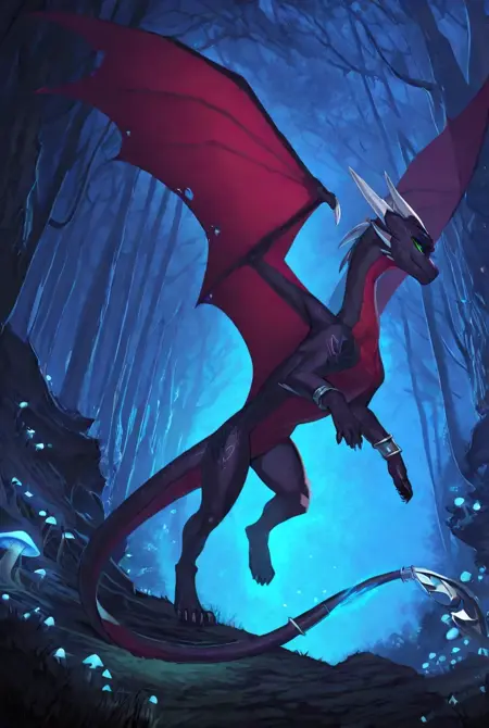 Cynder, dragon, feral, green eyes, black scales, two-tone scales, tail, tail ring, horns, wings, membranous wings, claws