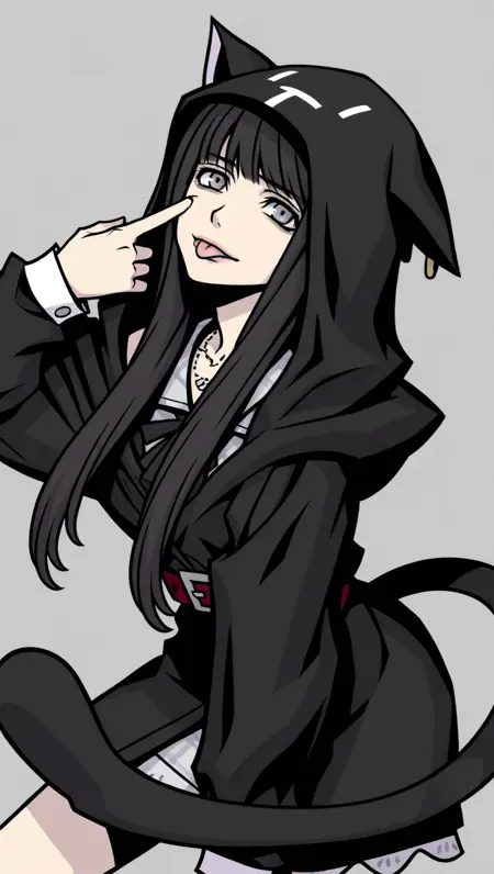 default tags: shokaNEO, 1girl, long hair, black hair, grey eyes, grey plaid dress, black ribbon, cat hoodie, red belt, socks, black shoes, necklace,