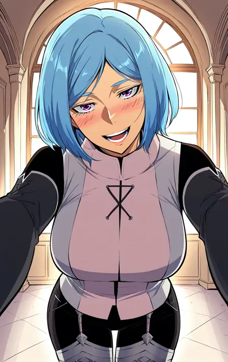 손아, 1명의 소녀, 짧은 파란 머리, 옆으로 갈라진 머리, 보라색 눈, 머리클립, 머리 장식,