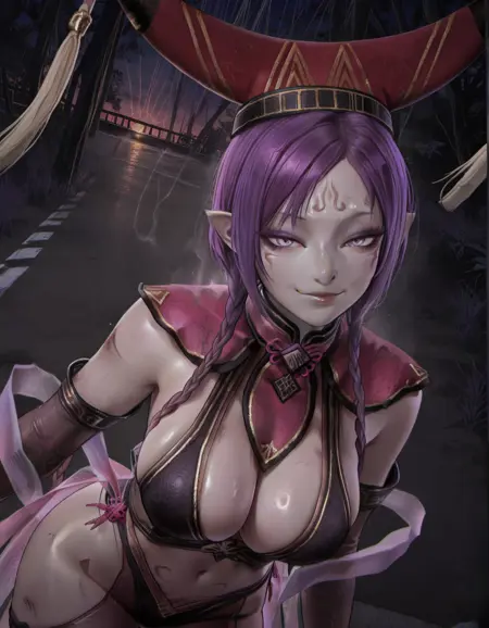 DaJi, 보라색 머리, 보라색 눈, 두 줄의 묶은 머리 또는 땋은 머리, 뾰족한 귀,