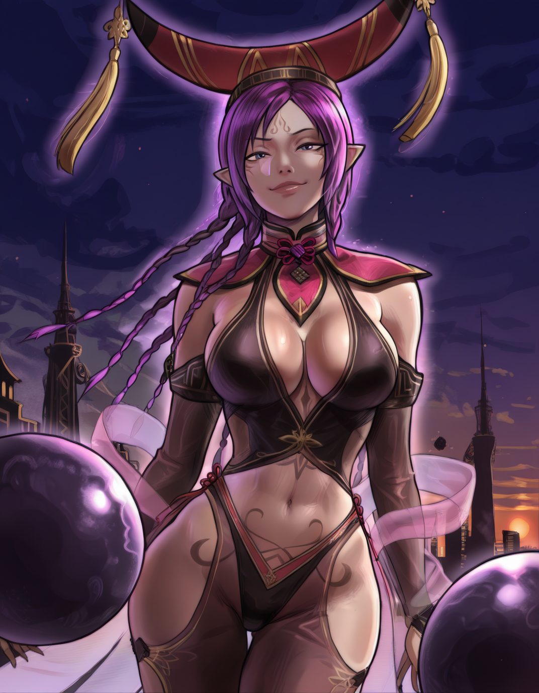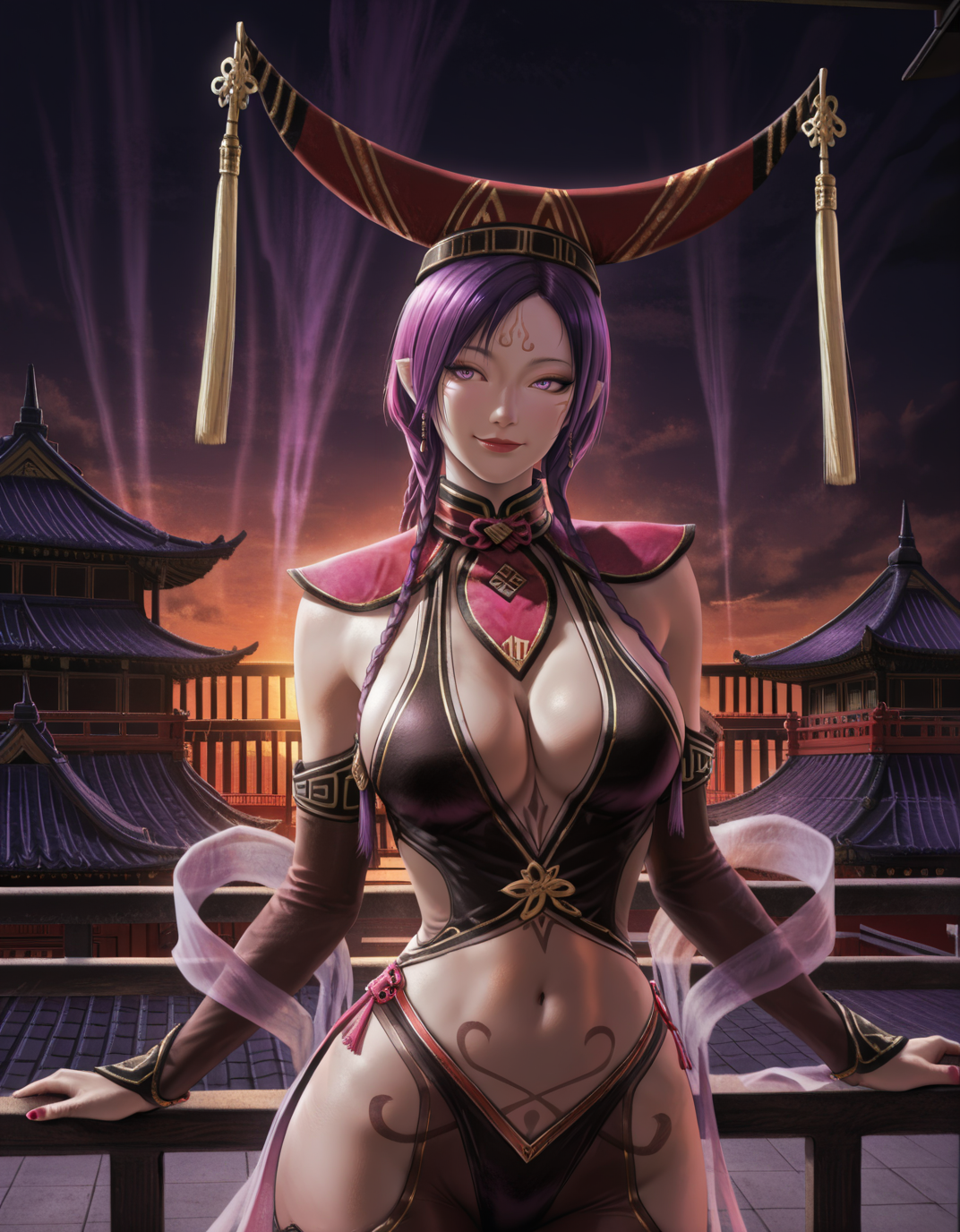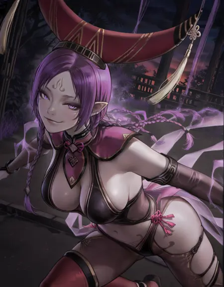 DaJi、紫髪、紫目、とがった耳、二重編み髪、または編み髪、ポニーテール、