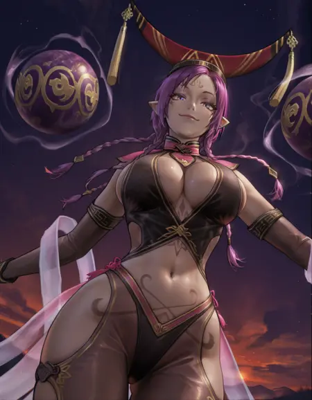 그녀의 복장은 매우 구체적이며 일부 프롬프트는 누락되거나 부정확할 수 있습니다