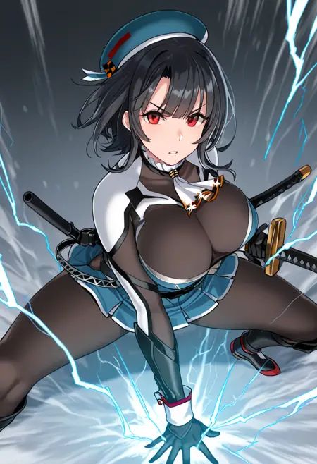 "takao_default, pleated skirt, black pantyhose": 기본 의상. 칼은 추가 프롬프트가 필요합니다. 스커트와 팬티혼스는 여러 의상에 공통된 요소이므로 명시적으로 지정해야 합니다.