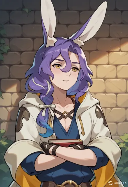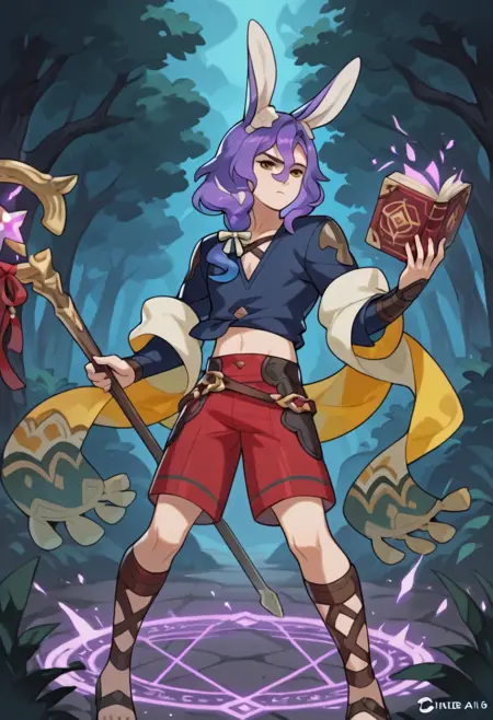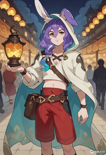 1个男孩,男性焦点,单人,诺温,德拉利亚失落,动物耳朵,兔耳,长发,紫发,蓝发,兔耳,辫子,痣,多色头发,头发位于眼睛之间,黄眼,系扣衬衫,蓝衬衫,包,背心,红短裤,腰带,肚脐,凉鞋,角斗士凉鞋,全身,花朵,珠宝,珠串手链,草帽,帽子,书,打开的书