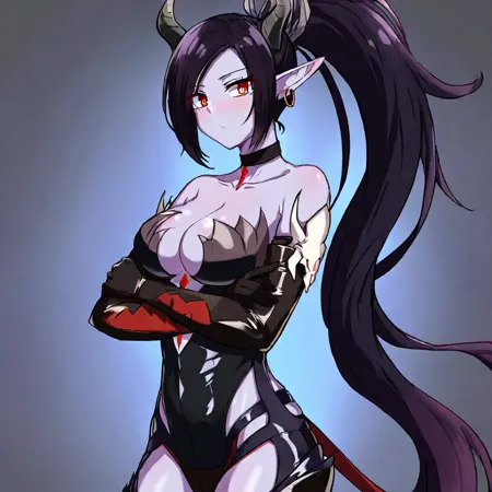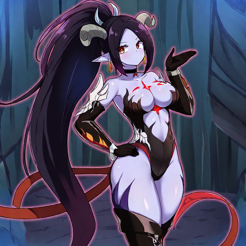 | トレーニングワード | DNF_Mistress_ss, 1girl, solo, black hair, very long hair, ponytail, colored skin, purple skin, red eyes, pointy ears, horns, tail, demon girl, large breasts, cleavage, collarbone, revealing clothes, bare shoulders, choker, earrings, jewelry, gloves, black gloves, elbow gloves, thighhighs, boots, thigh boots, black footwearコピーしました! |