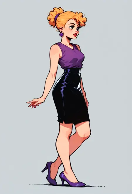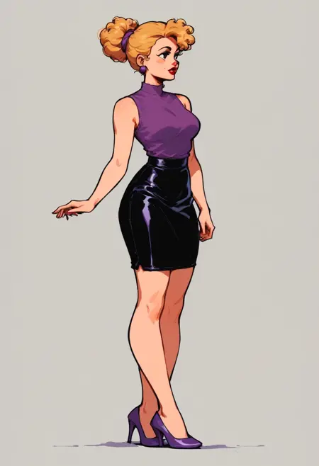 DonaXarleneTDM, 1girl, curly blonde hair styled in a bun, sleeveless purple top, black skirt, purple high heels, purple earrings, red lips, lipstick, black eyes,