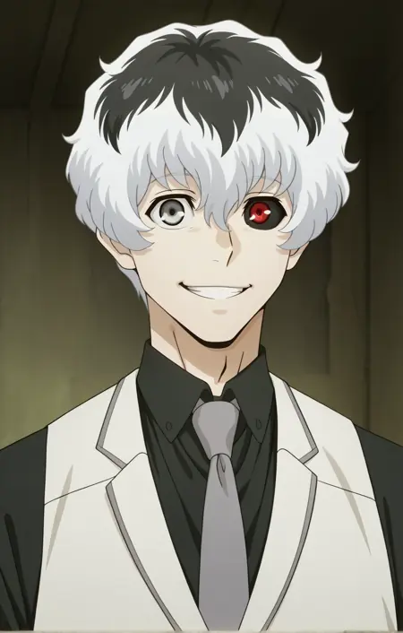 Ver3: Ken Kaneki at grow man with white and black hair and grey eyes