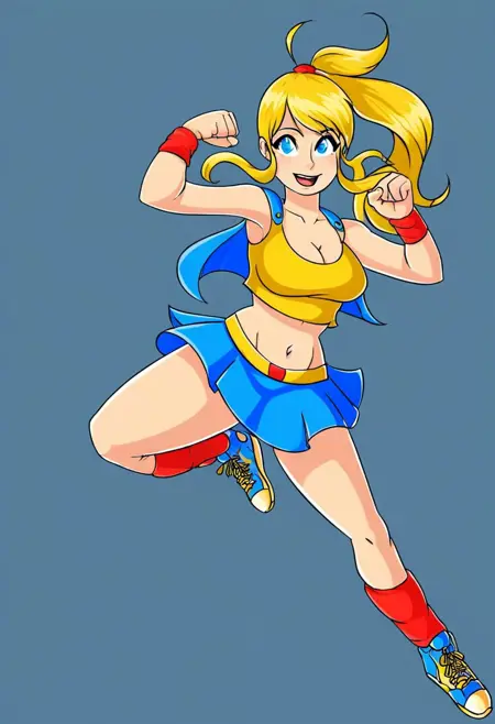 chan-chan, 1girl, solo, blondie hair, long hair, ponytail, blue eyes, midriff, navel, blue skirt, yellow crop top, cleavage, sneakers,