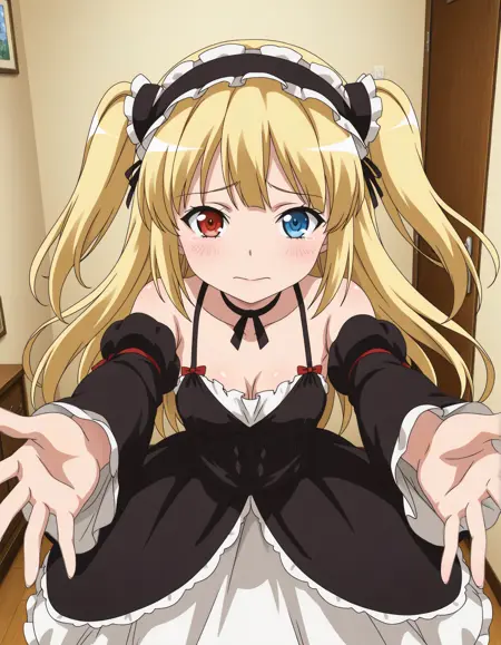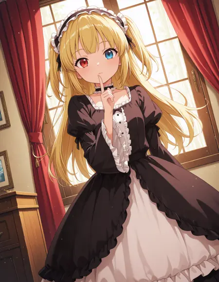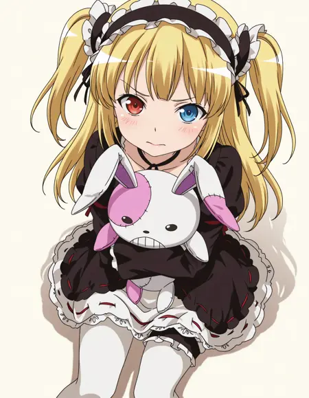 hairband, kobohaga, golden blonde hair, 1girl, blonde hair, two side up, long hair, solo, heterochromia, red eyes, blue eyes, fashion, gothic fashion, dress, blush, stuffed toy, stuffed animal, stuffed bunny, smile, looking at viewer, sitting, open mouth, pantyhose, doll hug, object hug, bare shoulders, black dress, bridal garter, detached sleeves, long sleeves, window, shoes, wariza, underwear, panties, white background, simple background, breasts, small breasts, tears, strap slip, choker, outdoors, white pantyhose, skirt, school uniform, cherry blossoms, mary janes, thighhighs, armpits, checkered background, swimsuit, day, indoors, :t, barefoot, pout, puffy sleeves, juliet sleeves, curtains, navel, serafuku, black skirt, pleated skirt, neckerchief, panty pull, clothes lift, kneeling, dress lift, pussy, solo focus, blurry, arms up, off shoulder, lying, on back, dakimakura (medium), flat chest, wine glass, drinking glass, wine, cup, alcohol, bikini, outstretched arms, front-tie top, sun, red bikini, side-tie bikini bottom, spread arms, sky, v over eye, frown, yawning, one eye closed, arm up, single thighhigh, closed mouth, finger to mouth, frills, innertube, water, one-piece swimsuit, ocean, cloud, collarbone, tongue, candle, fang, white shirt, no shoes, heart, letter, foreshortening, parody, anime coloring, chopsticks, ribbon, bloomers, hair ribbon, game controller, controller, playing games