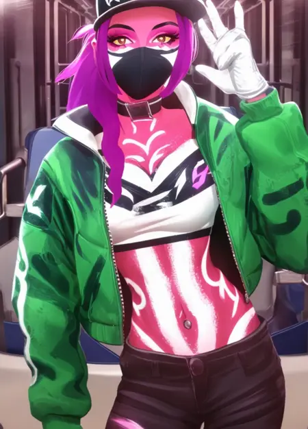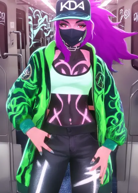 아칼리 그래피티 버전: lora:lol-kda-06:0.8, 마스터피스, 상세함, 고화질, k/da(리그 오브 레전드), 1명의 소녀, 싱글, 긴 머리, 가슴, 관찰자 바라봄, 장갑, 모자, 배꼽, 장신구, 자켓, 폰티일, 보라색 머리, 벌어진 옷, 목걸이, 복부, 팔찌, 벌어진 자켓, 크롭 탑, 메이크업, 마스크, 빛남, 레터박스, 야구 모자, 크롭된 자켓, 입 마스크, 아이돌, 기차 내부, 바디페인팅, 그래피티, 네온 조명