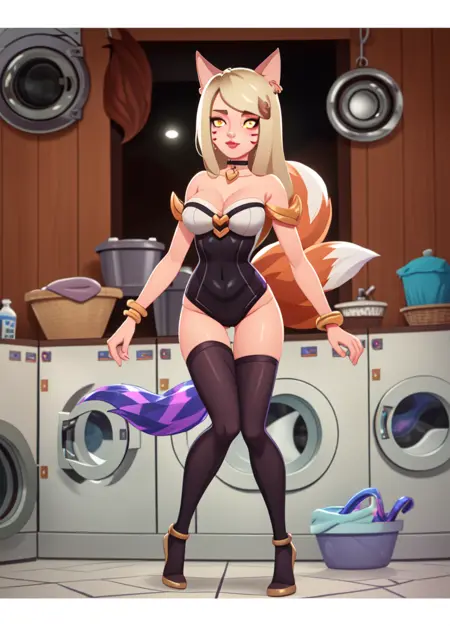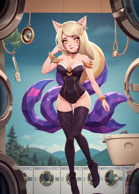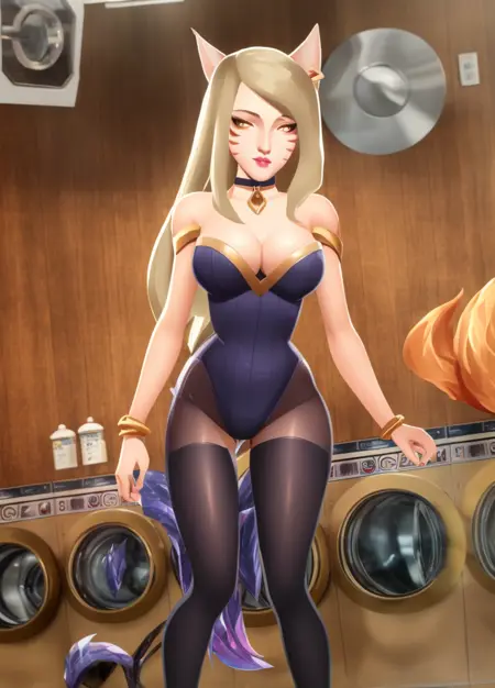 아리: lora:lol-kda-06:0.8 마스터피스, 상세함, 고화질, k/da(리그 오브 레전드), 1명의 소녀, 싱글, 긴 머리, 가슴, 앞머리, 금발, 큰 가슴, 허벅지까지 오는 양말, 동물 귀, 젖가슴, 어깨 드러남, 장신구, 꼬리, 노란 눈, 하트, 귀걸이, 목걸이, 팔찌, 레오타드, 여우 귀, 메이크업, 여우 꼬리, 얼굴 무늬, 레터박스, 수염 무늬, 하트 목걸이, 스피커, 세탁기,