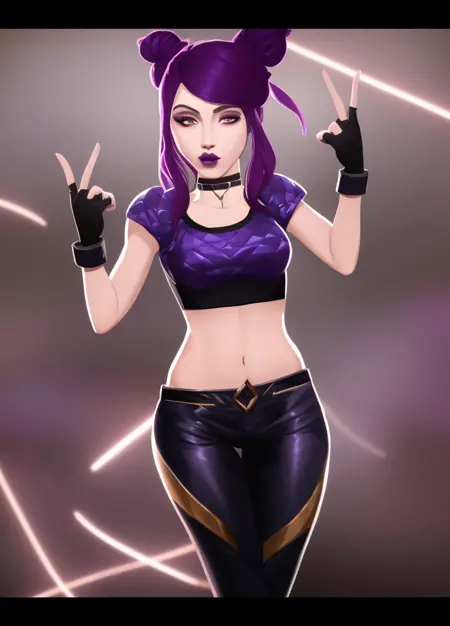 카이사: lora:lol-kda-06:0.8, 마스터피스, 상세함, 고화질, k/da(리그 오브 레전드), 1명의 소녀, 싱글, 가슴, 장갑, 배꼽, 중간 크기 가슴, 보라색 눈, 보라색 머리, 목걸이, 검은 장갑, 복부, 손가락 없는 장갑, 머리결, 크롭 탑, 메이크업, 검은 목걸이, 립스틱, 레터박스, 보라색 입술, 바지,