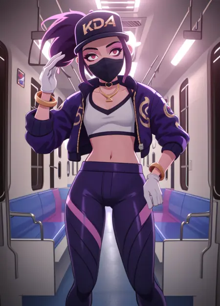 아칼리 일반 버전: lora:lol-kda-06:0.8, 마스터피스, 상세함, 고화질, k/da(리그 오브 레전드), 1명의 소녀, 싱글, 긴 머리, 가슴, 관찰자 바라봄, 장갑, 모자, 배꼽, 장신구, 자켓, 폰티일, 보라색 머리, 벌어진 옷, 목걸이, 복부, 팔찌, 벌어진 자켓, 크롭 탑, 메이크업, 마스크, 빛남, 레터박스, 야구 모자, 크롭된 자켓, 입 마스크, 아이돌, 기차 내부,